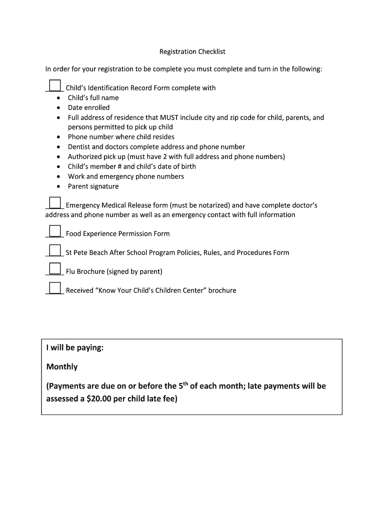 Registration Checklist In order for your registration to be complete you must complete and turn in the following: Child's Identification Record Form complete with Child's full name Date enrolled Full