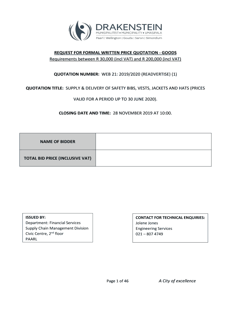 REQUEST FOR FORMAL WRITTEN PRICE QUOTATION GOODS Requirements between R 30,000 (incl VAT) and R 200,000 (incl VAT) QUOTATION NUMBER: WEB 21: 2019/2020 (ADVERTISE) (1) QUOTATION TITLE: SUPPLY & DELIVERY