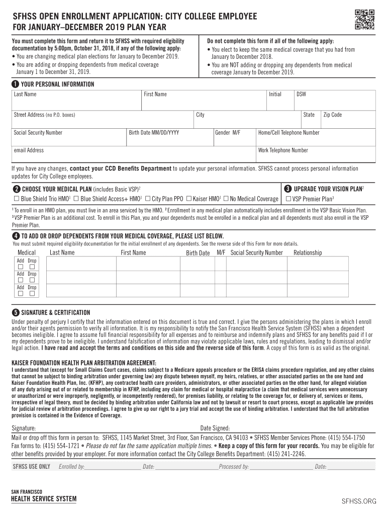 SF HSS OPEN ENROLLMENT APPLICATION: CITY COLLEGE EMPLOYEE FOR JANUARYDECEMBER 2019 PLAN YEA RMF SF CCD Application not complete this form if all the following apply: You elect to keep the same medical