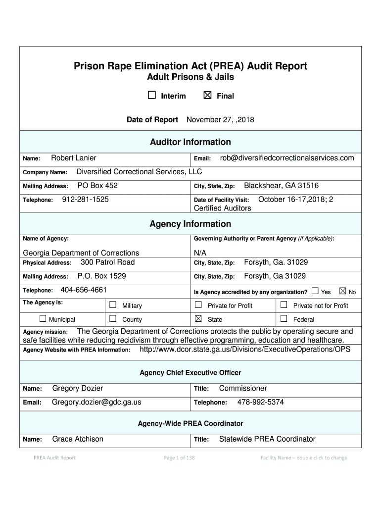 Prison Rape Elimination Act (AREA) Audit Report Adult Prisons & JailsInterimDate of ReportFinalNovember 27,2018Auditor Information Name:Robert LanierEmail:Company Name:Diversified Correctional Services,