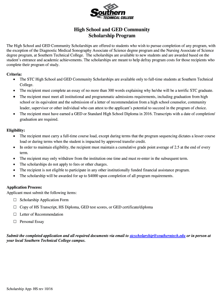 The High School and GED Community Scholarships are offered to students who wish to pursue completion of any program, except the Diagnostic Medical