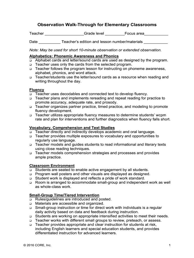 Observation Walkthrough for Elementary Classrooms Teacher Grade level Focus area Date Teachers edition and lesson number/materials Note: May be used for short 10minute observation or extended observation.