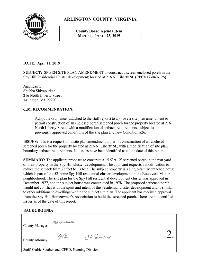 SUBJECT: SP #124 SITE PLAN AMENDMENT to construct a screen enclosed porch in the