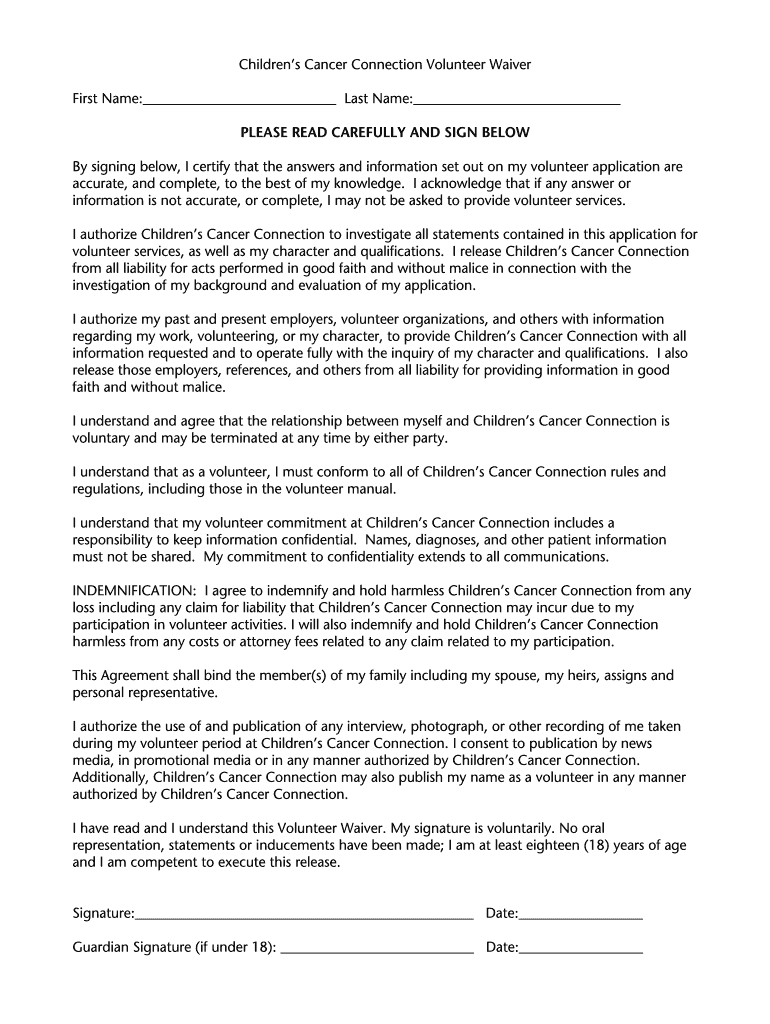 Children's Cancer Connection Volunteer Waiver First Name: Last Name: PLEASE READ CAREFULLY AND SIGN BELOW By signing below, I certify that the answers and information set out on my volunteer application