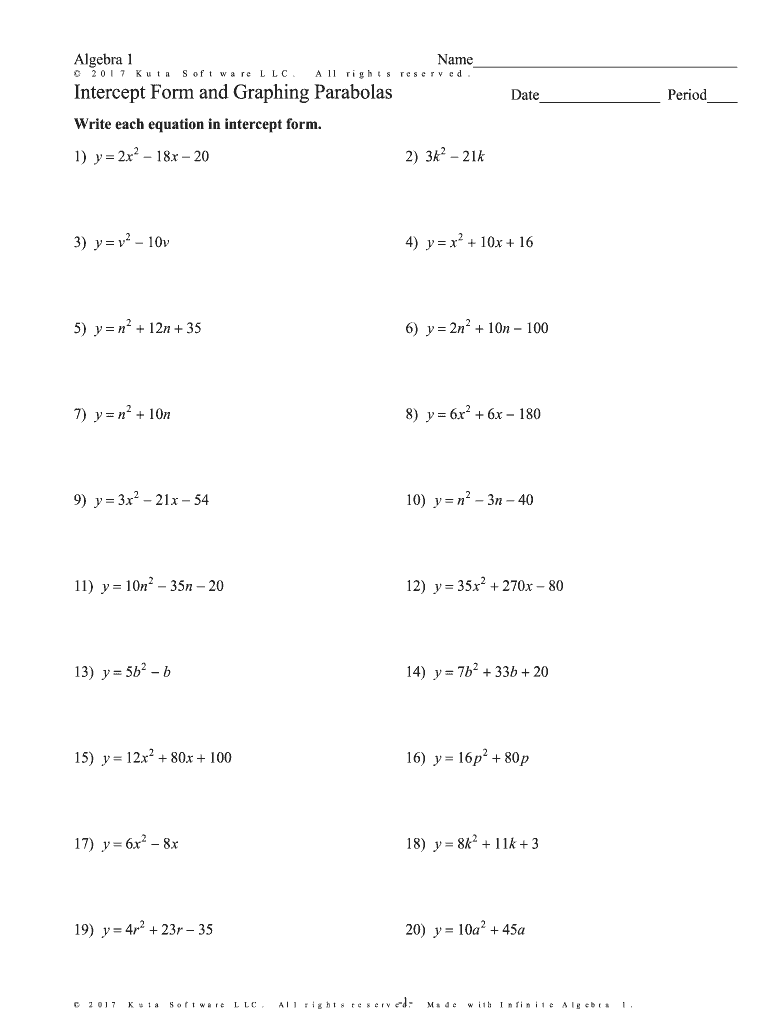 Get the free Infinite Algebra 1 - Intercept Form and Graphing Parabolas