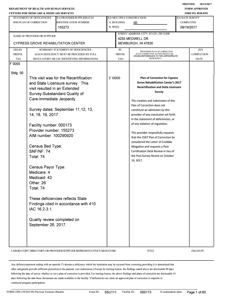PRINTED: DEPARTMENT OF HEALTH AND HUMAN SERVICES CENTERS FOR MEDICARE & MEDICAID SERVICES STATEMENT OF DEFICIENCIES(X1) PROVIDER/SUPPLIER/LIGAND PLAN OF CORRECTIONIDENTIFICATION NUMBER:15527310/13/2017FORM