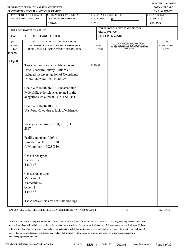 PRINTED: DEPARTMENT OF HEALTH AND HUMAN SERVICES CENTERS FOR MEDICARE & MEDICAID SERVICES STATEMENT OF DEFICIENCIES(X1) PROVIDER/SUPPLIER/LIGAND PLAN OF CORRECTIONIDENTIFICATION NUMBER:15572009/20/2017FORM
