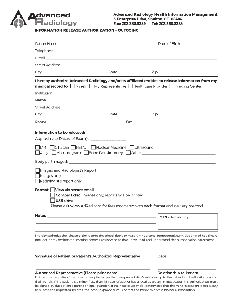 Advanced Radiology Health Information Management 3 Enterprise Drive, Shelton, CT 06484 Fax: 203.380.3289 Tel: 203.380.3284 INFORMATION RELEASE AUTHORIZATION OUTGOINGPatient Name Date of BirthTelephone