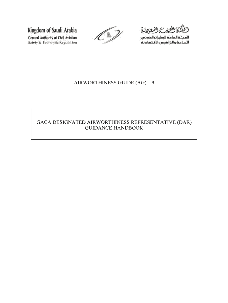 AIRWORTHINESS GUIDE (AG) 9GACA DESIGNATED AIRWORTHINESS REPRESENTATIVE (DAR) GUIDANCE HANDBOOKRevision History Affected Issue Description of Change Issue Date Pages/ umber (Administrative, Scope,