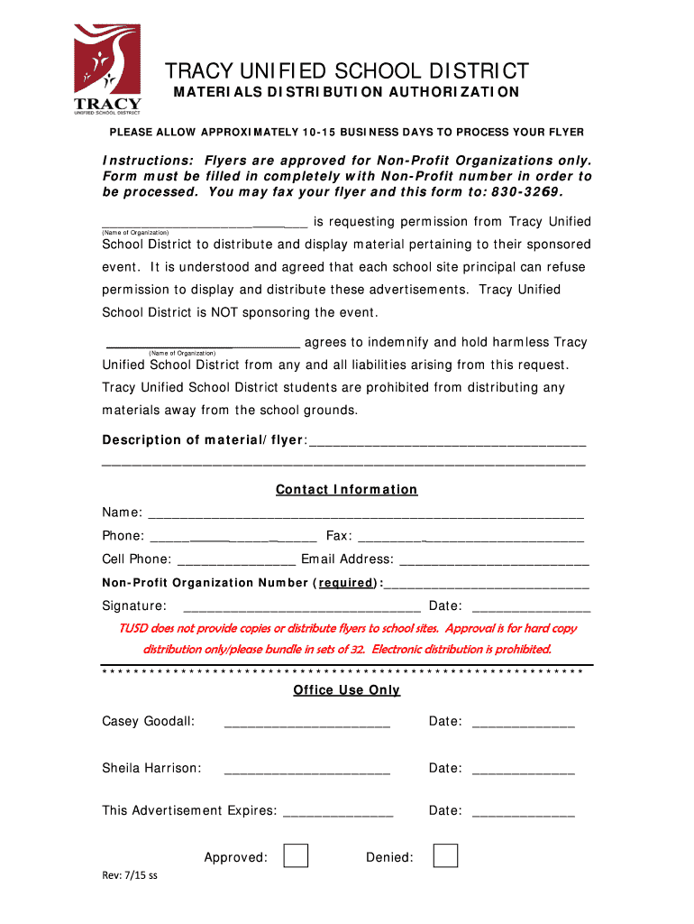 TRACY UNIFIED SCHOOL DISTRICT MATERIALS DISTRIBUTION AUTHORIZATIONPLEASE ALLOW APPROXIMATELY 1015 BUSINESS DAYS TO PROCESS YOUR FLYERInstructions: Flyers are approved for Nonprofit Organizations only.