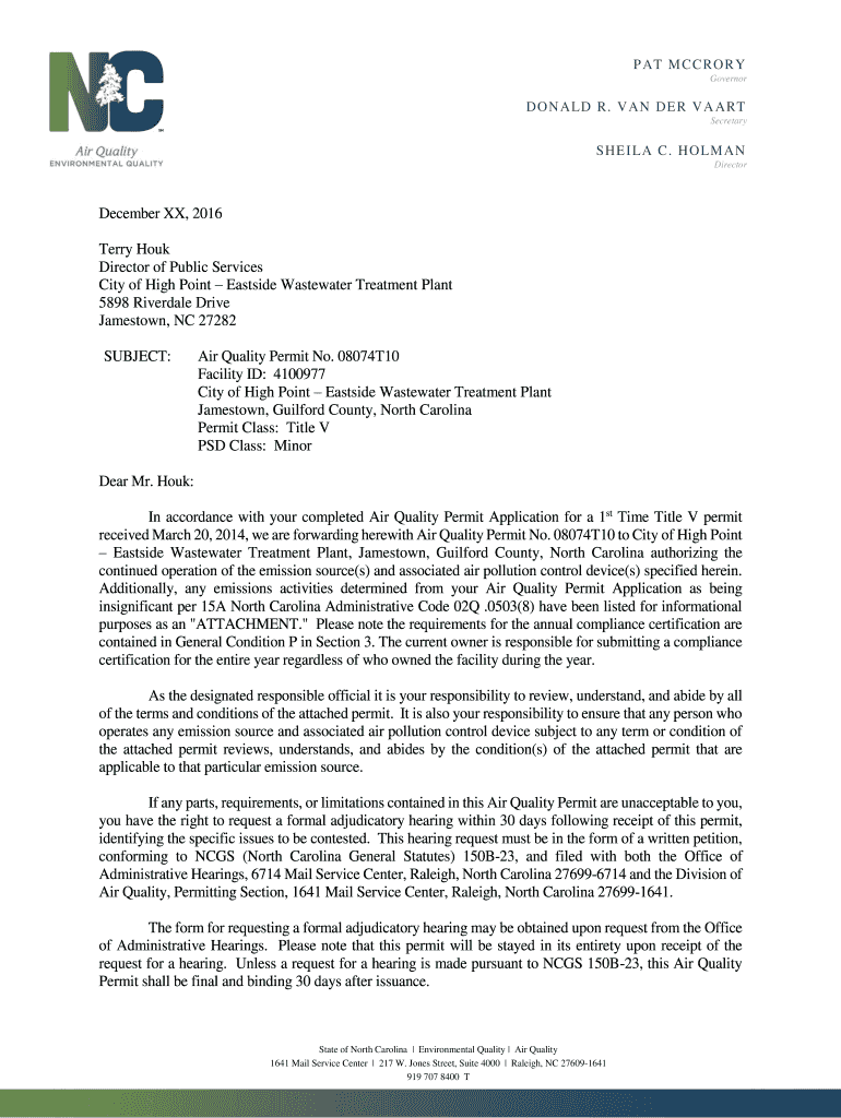P AT M C RO R Y Governor DO N ALD R. V AN DE R V A ART Secretaryship I LA C. H O LM AN Director December XX, 2016 Terry Hour Director of Public Services City of High Point Eastside Wastewater Treatment