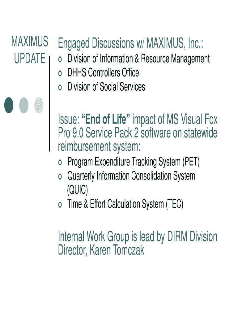 MAXIMUS UPDATEEngaged Discussions w/ MAXIMUS, Inc.: Division of Information & Resource Management HHS Controllers Office Division of Social ServicesIssue: End of Life impact of MS Visual Fox Pro 9.0