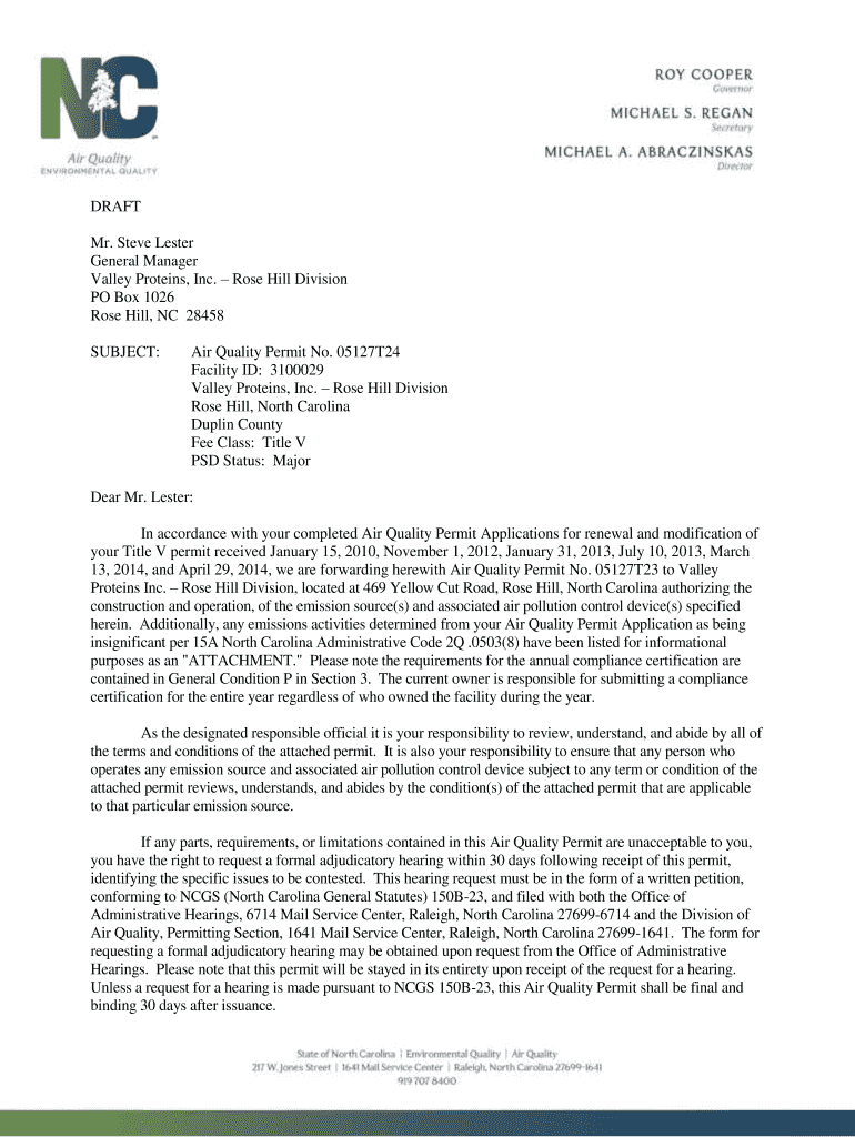 DRAFT Mr. Steve Lester General Manager Valley Proteins, Inc. Rose Hill Division PO Box 1026 Rose Hill, NC 28458 SUBJECT:Air Quality Permit No. 05127T24 Facility ID: 3100029 Valley Proteins, Inc. Rose