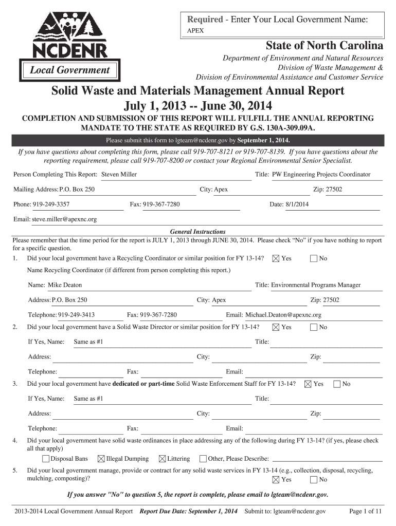 Required Enter Your Local Government Name: Apostate of North Carolina Department of Environment and Natural Resources Division of Waste Management & Division of Environmental Assistance and Customer