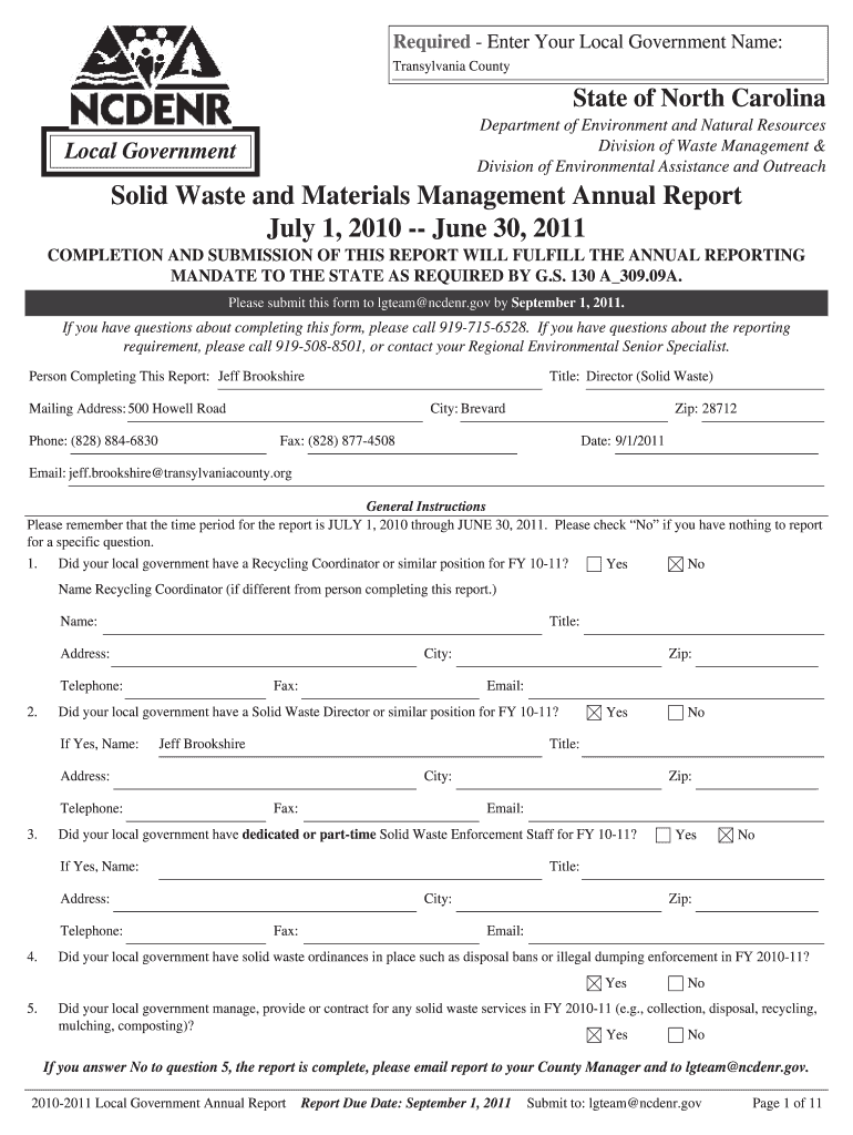 Required Enter Your Local Government Name: Transylvania CountyState of North Carolina Department of Environment and Natural Resources Division of Waste Management & Division of Environmental Assistance