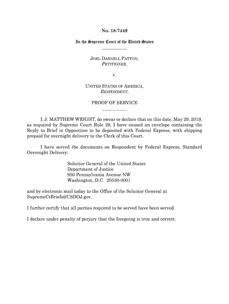 No. 187449 In the Supreme Court of the United States JOEL DARNELL PATTON, PETITIONER, V.UNITED STATES OF AMERICA, RESPONDENT, PROOF OF SERVICE I, J. MATTHEW WRIGHT, do swear or declare that on this