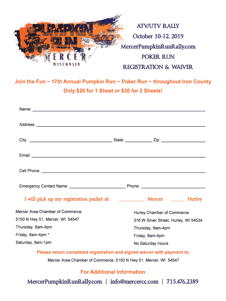 ATV/UTV RALLY October 1012, 2019 MercerPumpkinRunRally.com POKER RUN REGISTRATION & WAIVER Join the Fun 17th Annual Pumpkin Run Poker Run throughout Iron Countably $20 for 1 Sheet or $30 for 2 Sheets!