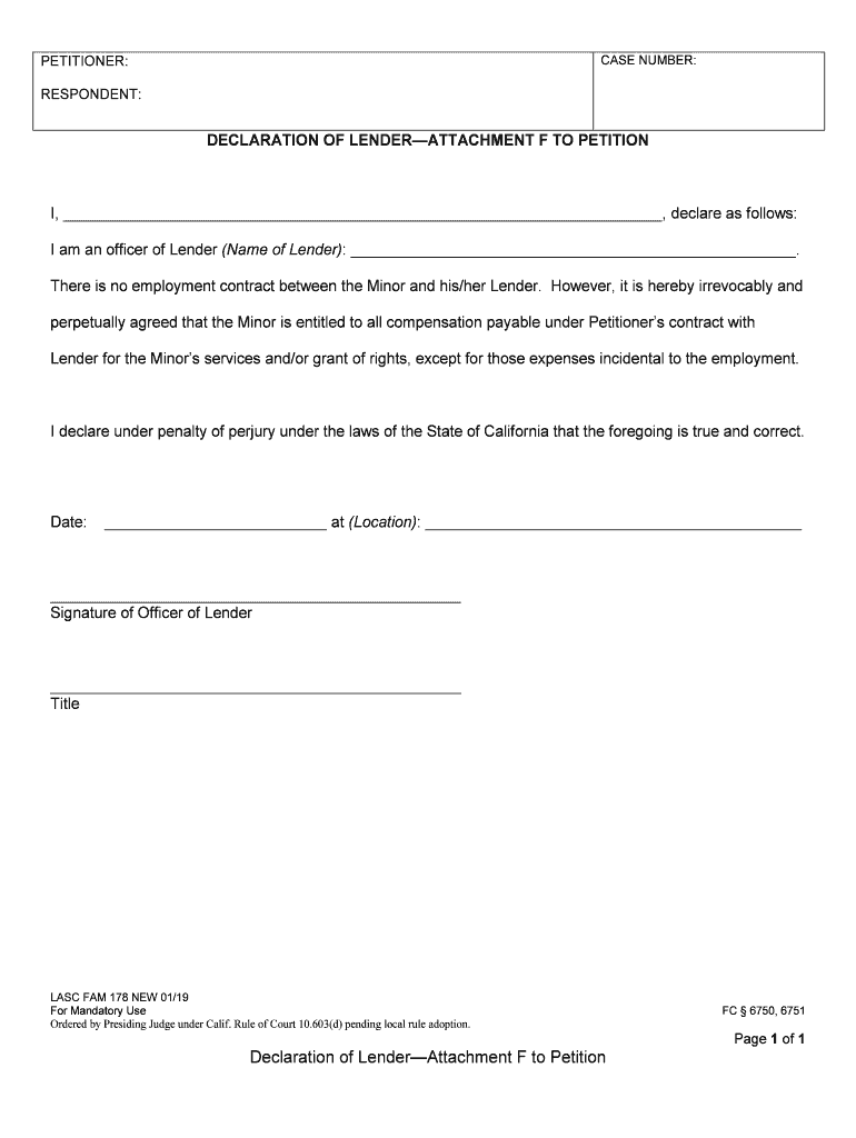 PETITIONER:CASE NUMBER:RESPONDENT:DECLARATION OF LENDERATTACHMENT F TO PETITION, declare as follows: I am an officer of Lender (Name of Lender):. There is no employment contract between the Minor
