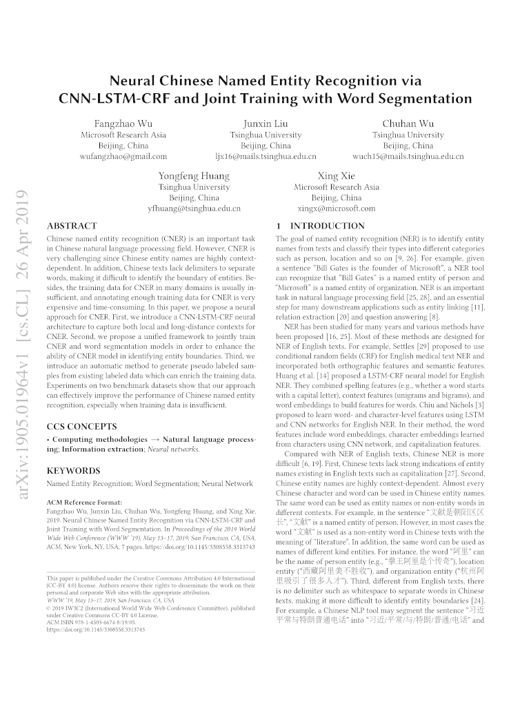 arXiv:1905.01964v1 cs. CL 26 Apr 2019Neural Chinese Named Entity Recognition via CNNLSTMCRF and Joint Training with Word Segmentation Hangzhou WuJunxin Sichuan Wu Microsoft Research Asia Beijing,