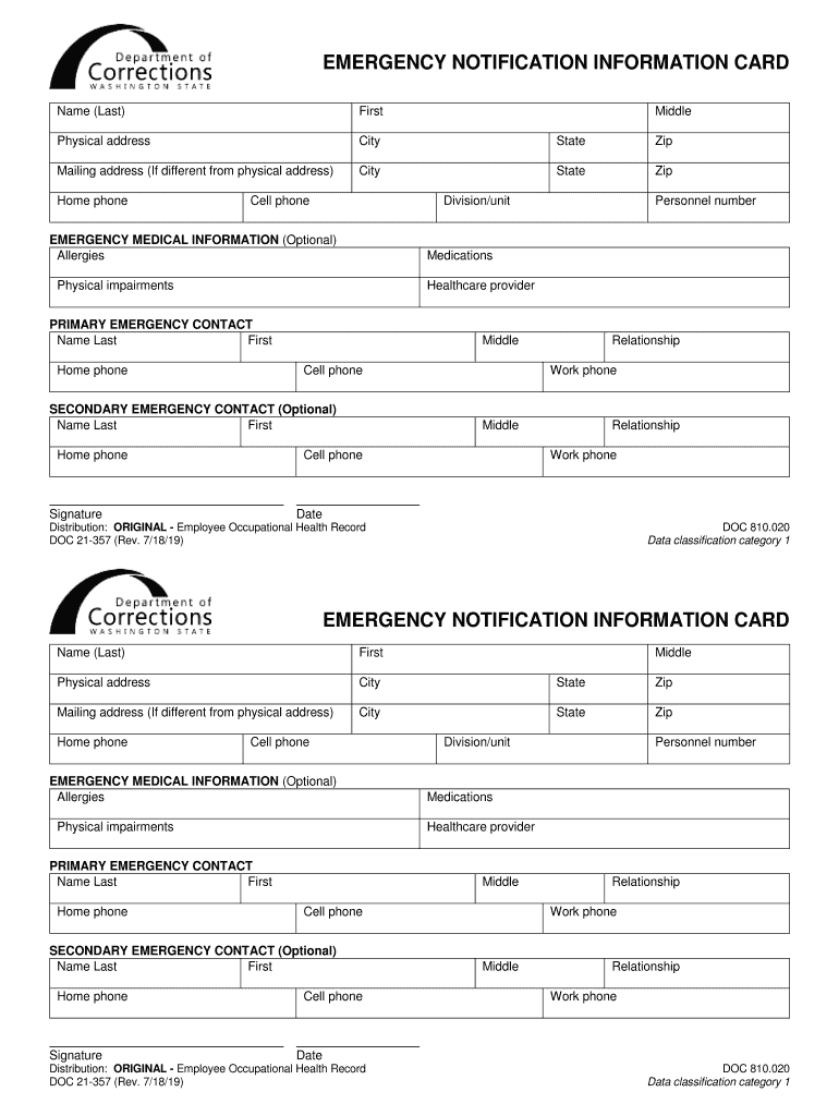 EMERGENCY NOTIFICATION INFORMATION CARD