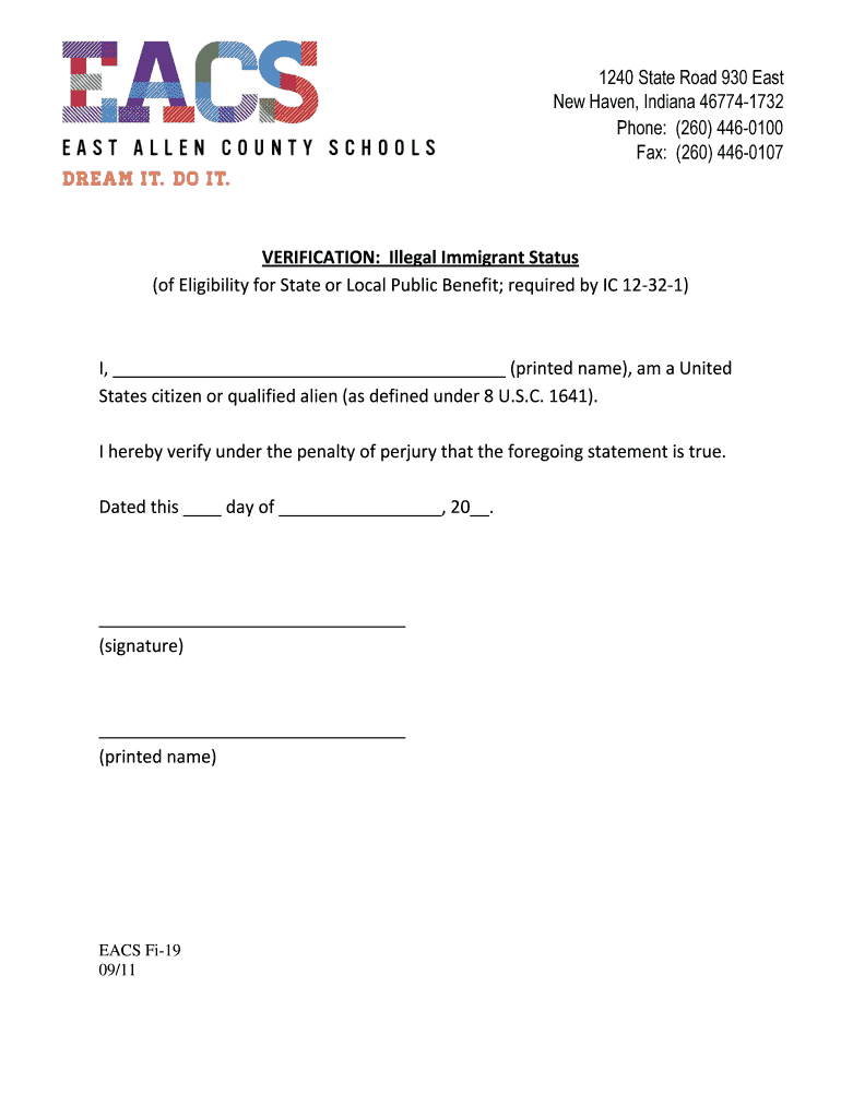 1240 State Road 930 East New Haven, Indiana 467741732 Phone: (260) 4460100 Fax: (260) 4460107VERIFICATION: Undocumented migrant Status (of Eligibility for State or Local Public Benefit; required by