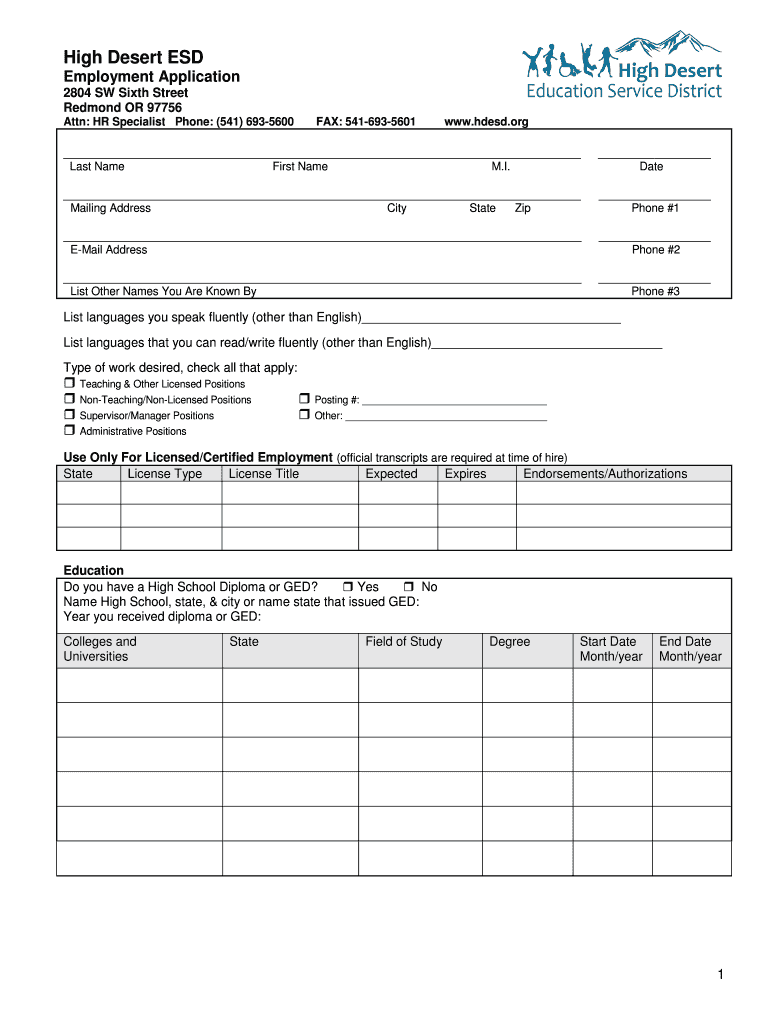 High Desert ESD Employment Application 2804 SW Sixth Street Redmond OR 97756 Attn: HR Specialist Phone: (541) 6935600FAX: 5416935601www.held.org Last NameFirst Name Date Mailing Address M.I. Cityscape