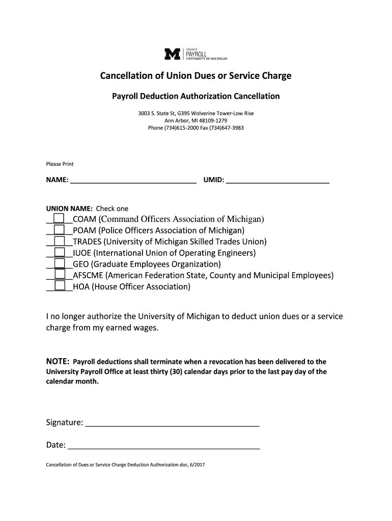 Cancellation of Union Dues or Service Charge Payroll Deduction Authorization Cancellation 3003 S. State St, G395 Wolverine Tower Rise Ann Arbor, MI 481091279 Phone (734)6152000 Fax (734)6473983Please