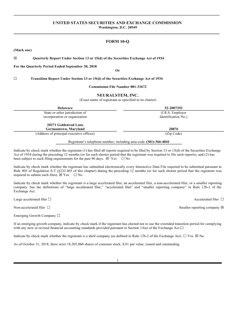 Neuralstem Inc, as a publicly traded company, is required to file Form 10-Q with the SEC.