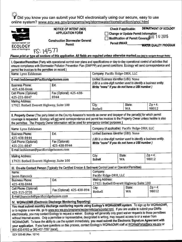 Get the free Notice of Intent (NOI) Application Form - Snohomish County