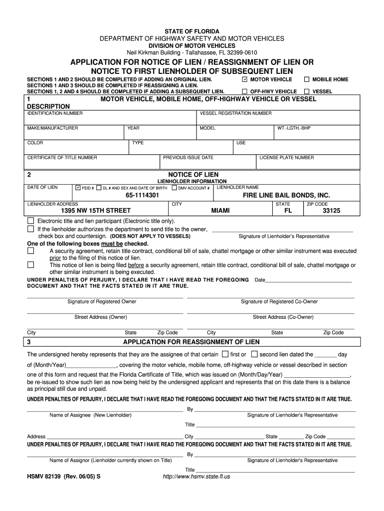 STATE OF FLORIDADEPARTMENT OF HIGHWAY SAFETY AND MOTOR VEHICLES DIVISION OF MOTOR VEHICLES Neil Kirkman Building Tallahassee, FL 323990610APPLICATION FOR NOTICE OF LIEN / REASSIGNMENT OF LIEN OR NOTICE