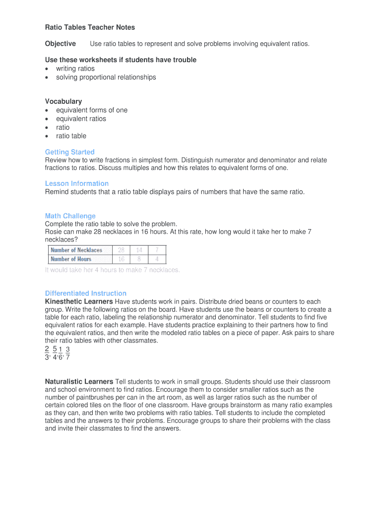 Get the free Ratio Tables Teacher Notes Objective Use these worksheets if ...