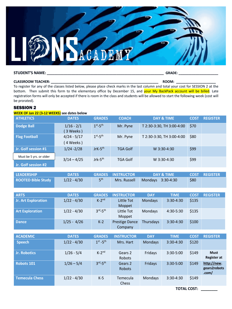 LI NS STUDENTS NAME: GRADE: CLASSROOM TEACHER: ROOM: To register for any of the classes listed below, please place check marks in the last column and total your cost for SESSION 2 at the bottom. Then