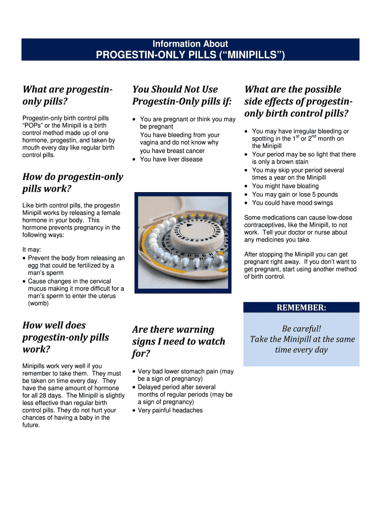 Information AboutPROGESTINONLY PILLS (INITIALS) What are progestin only pills? You Should Not Use ProgestinOnly pills if:Progestin only birth control pills Pops or the Minipill is a birth control