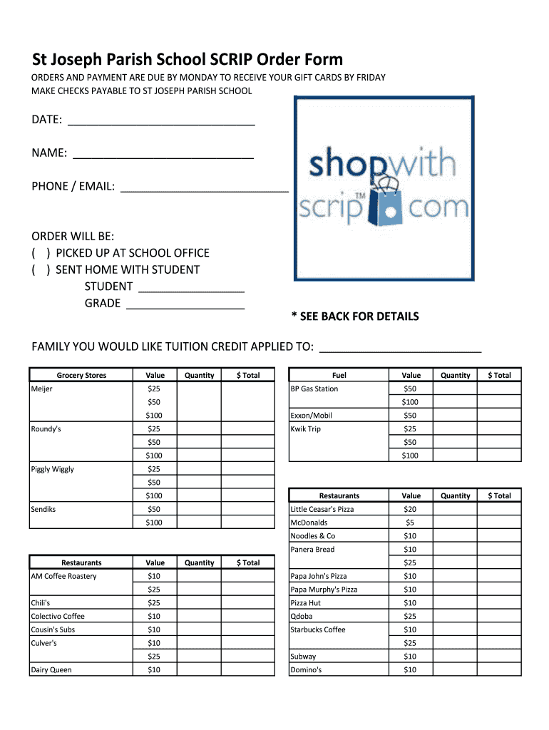 Get the free Scrip order form - St. Joseph Parish-Grafton WI
