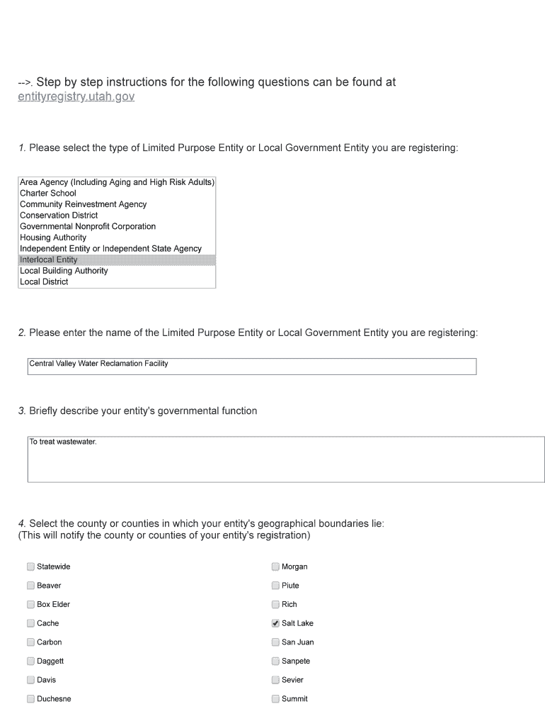 . Step-by-step instructions for the following questions can be found atentityregistry. Utah.gov1. Please select the type of Limited Purpose Entity or Local Government Entity you are registering: