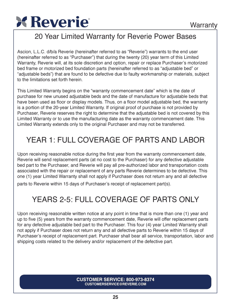 Warranty20 Year Limited Warranty for Reverie Power BasesAscion, L.L.C. d/b/a Reverie (hereinafter referred to as Reverie) warrants to the end user
