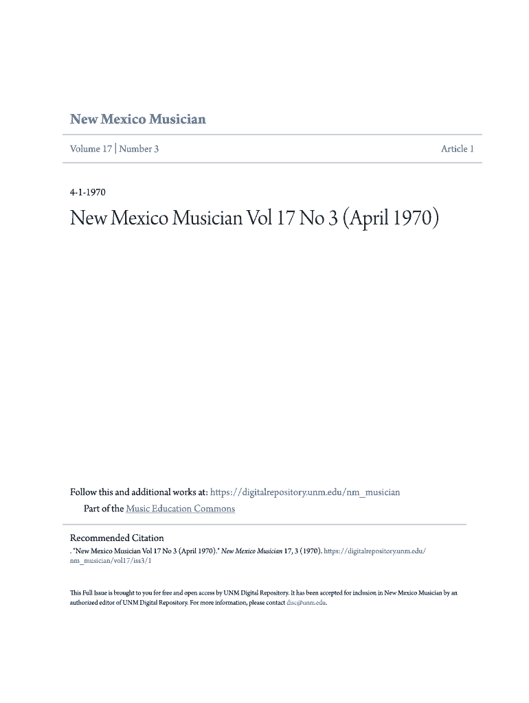 New Mexico Musician Volume 17 Number 3Article 1411970New Mexico Musician Vol 17 No 3 (April 1970)Follow this and additional works at: https://digitalrepository.unm.edu/nm musician Part of the Music