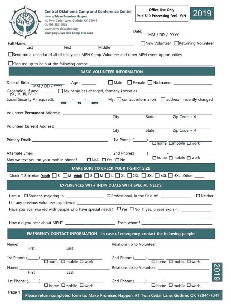 Office Use Only Paid $10 Processing Fee? Y/N2019Date: MM / DD / YYY New VolunteerFull Name: Last First MiddleReturning Volunteer Send me a calendar of all of this year's MPH Camp Volunteer and other