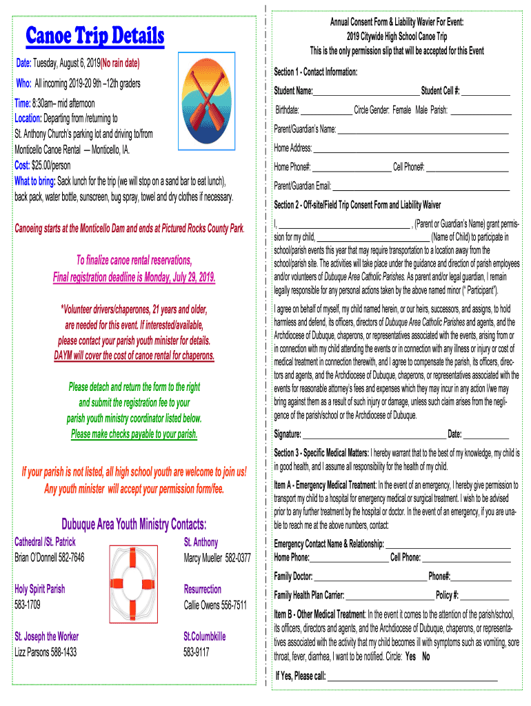 Annual Consent Form & Liability Wavier For Event: 2019 Citywide High School Canoe Trip This is the only permission slip that will be accepted for this Eventuate Trip Details Date: Tuesday, August