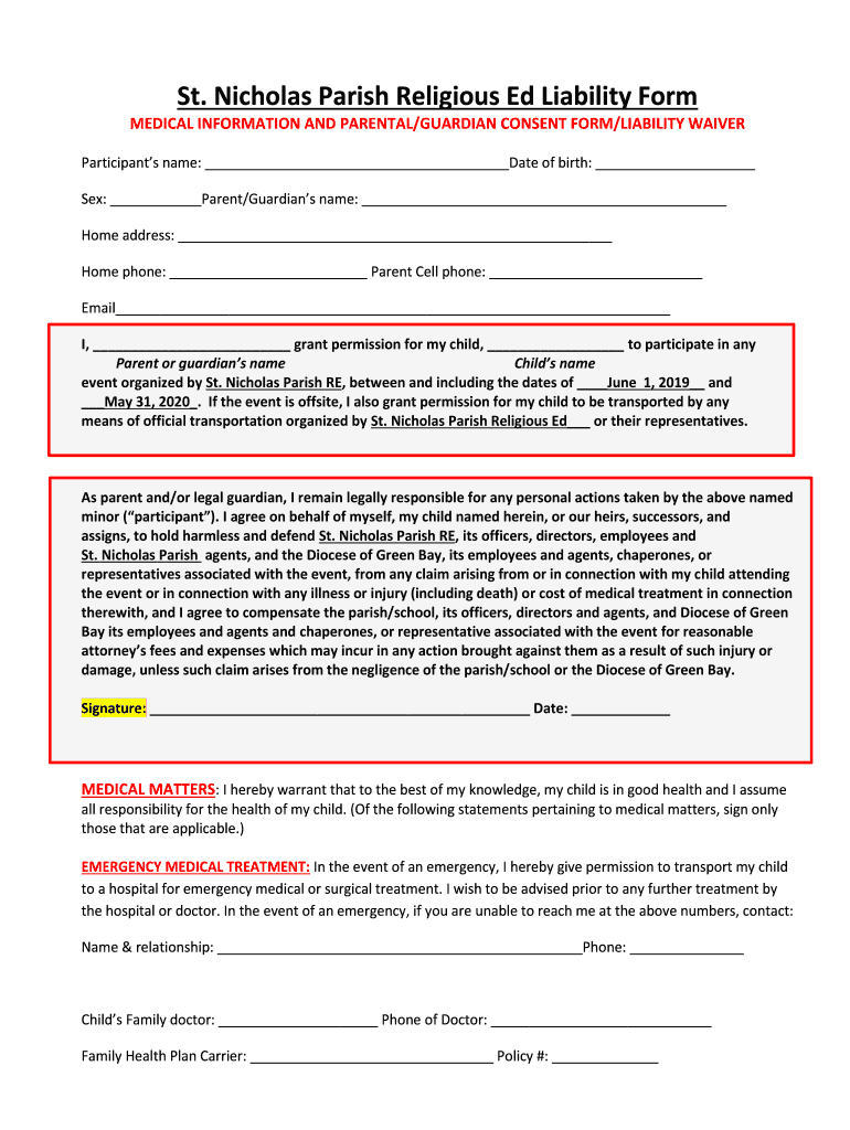 St. Nicholas Parish Religious Ed Liability Form MEDICAL INFORMATION AND PARENTAL/GUARDIAN CONSENT FORM/LIABILITY WAIVER Participants name: Date of birth: Sex: Parent/Guardians name: Home address: