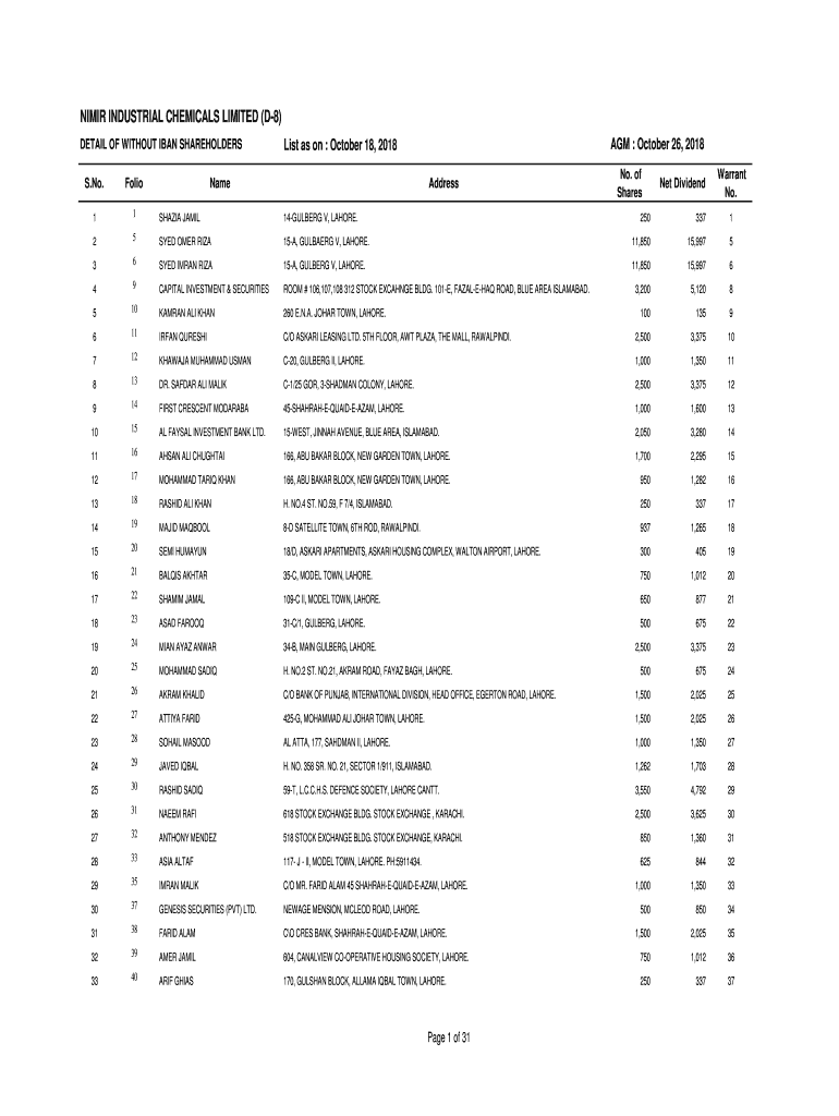 LIMIT INDUSTRIAL CHEMICALS LIMITED (D8) DETAIL OF WITHOUT IBAN SHAREHOLDERS AGM : October 26, 2018List as on : October 18, 2018NameAddressNo. Of SharesFolio11SHAZIA JAMIL14GULBERG V, LAHORE.250337125SYED