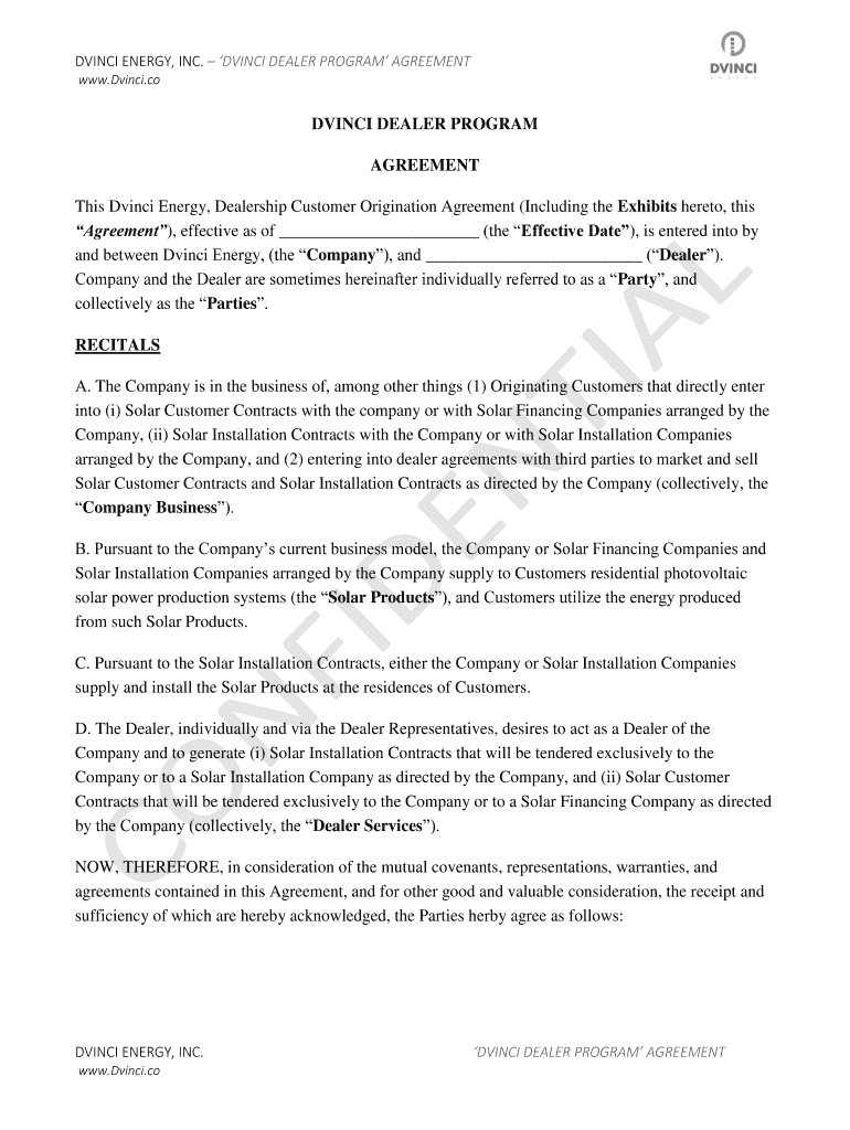 VINCI ENERGY, INC. VINCI DEALER PROGRAM AGREEMENT www.Dvinci.coDVINCI DEALER PROGRAM AGREEMENT This Vinci Energy, Dealership Customer Origination Agreement (Including the Exhibits hereto, this Agreement),