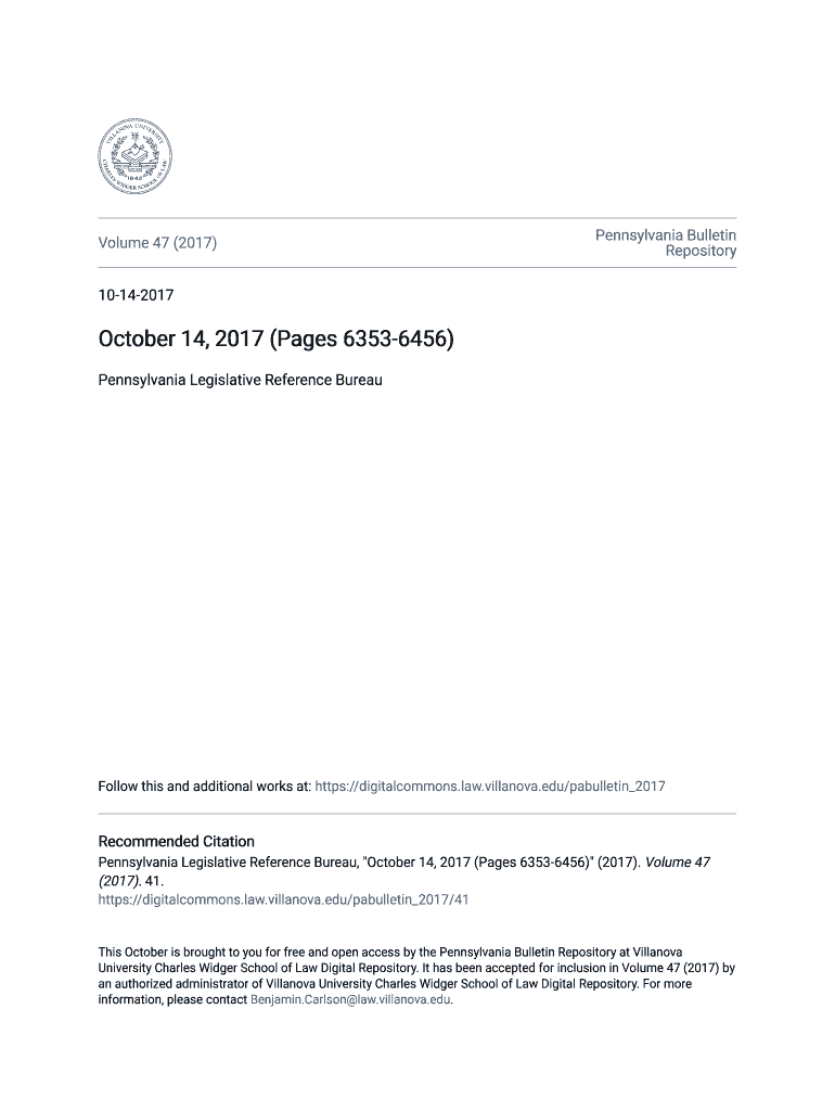 Volume 47 (2017)Pennsylvania Bulletin Repository10142017October 14, 2017 (Pages 63536456) Pennsylvania Legislative Reference BureauFollow this and additional works at: https://digitalcommons.law.villanova.edu/pabulletin