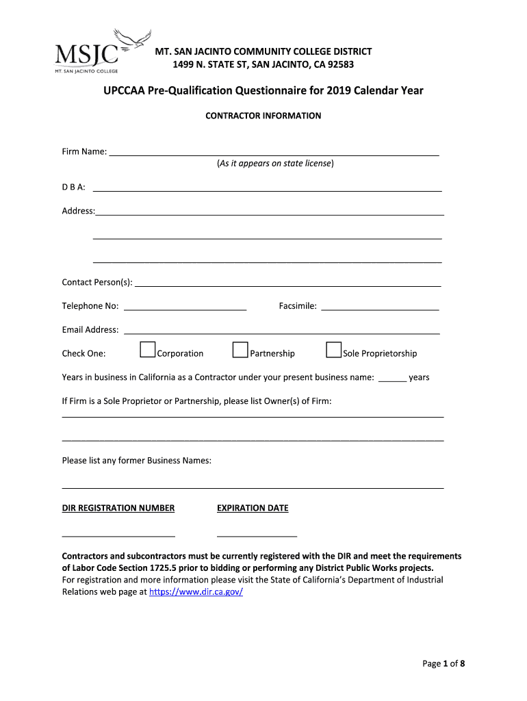 MT.SANJACINTOCOMMUNITYCOLLEGEDISTRICT 1499 N.STATES, San Jacinto,CA92583UPCCAAPreQualificationQuestionnairefor2019CalendarYear CONTRACTORINFORMATIONFirmName: (Asitappearsonstatelicense) DBA: Address: