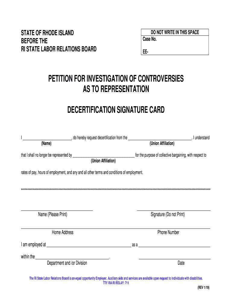 STATE OF RHODE ISLAND BEFORE THE RI STATE LABOR RELATIONS BOAR DDO NOT WRITE IN THIS SPACE Case No. REPETITION FOR INVESTIGATION OF CONTROVERSIES AS TO REPRESENTATION DESERTIFICATION SIGNATURE CARD