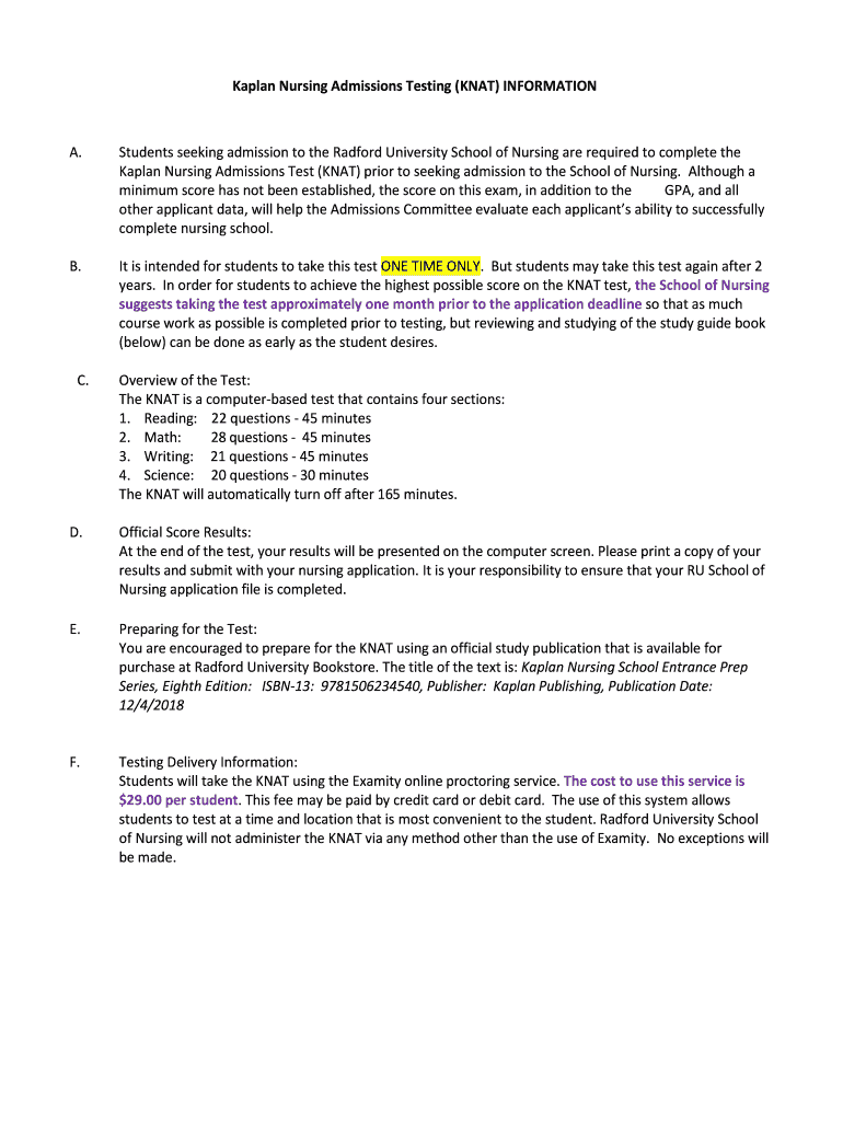 Kaplan Nursing Admissions Testing (KNOT) INFORMATION. Students seeking admission to the Bradford University School of Nursing are required to complete the
