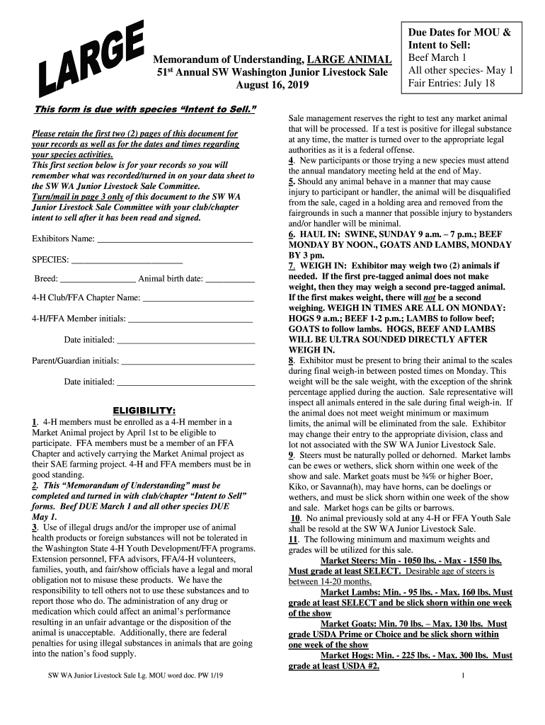 Memorandum of Understanding, LARGE ANIMAL 51st Annual SW Washington Junior Livestock Sale August 16, 2019Due Dates for YOU & Intent to Sell: Beef March 1 All other species May 1 Fair Entries: July
