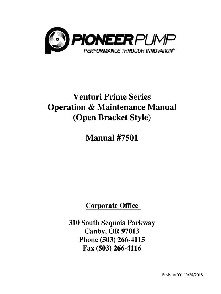 Venturi Prime Series Operation & Maintenance Manual (Open Bracket Style) Manual #7501Corporate Office 310 South Sequoia Parkway Candy, OR 97013 Phone (503) 2664115 Fax (503) 2664116Revision00110/24/2018Operation