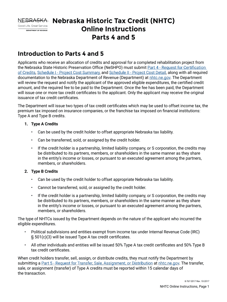 Nebraska Historic Tax Credit (NHC) Online Instructions Parts 4 and 5 Introduction to Parts 4 and 5 Applicants who receive an allocation of credits and approval for a completed rehabilitation project