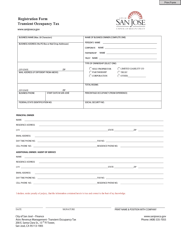 Print Preregistration Form Transient Occupancy Tax www.sanjoseca.gov NAME OF BUSINESS OWNER (COMPLETE ONE)BUSINESS NAME (Max. 30 Characters) BUSINESS ADDRESS (No PO Box or Mail Drop Addresses)PERSONS